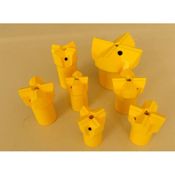Cross type bit with steel inserts using thread system. It has a slow penetration rate but it produces a very straight drill hole.